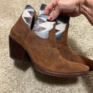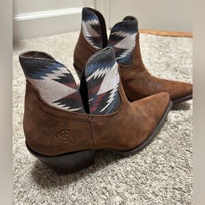 Chic Ariat ankle booties with a stylish patterned shaft. Rich brown leather for a classic look. Perfect for versatile wear. Worn these one time excellent condition