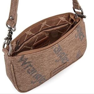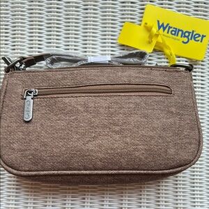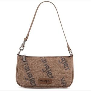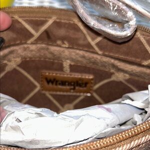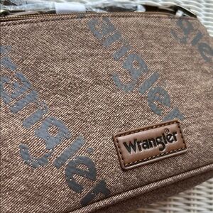 Chic Wrangler Shoulder bag in brown. Features a stylish design with logo detail. Swipe through all photos to see pocket details and how the strap is unwrapped — did not want to open for picture.