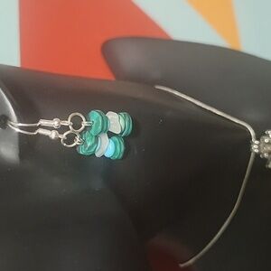 ●These beautiful earrings have emerald green beads with beautiful swirls in them, and then they are layered with synthetic turquoise beads and crystal quartz stones