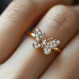 A delicate butterfly ring adorned with sparkling crystals, set on an elegant 18K gold filled band. Whimsical yet refined, perfect for stacking or wearing as a statement piece