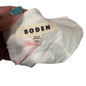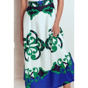 Capture attention in this stunning Boden maxi dress, a vibrant masterpiece that blends bold geometric patterns with a flattering silhouette. The crisp white canvas is adorned with striking emerald green and deep navy blue motifs, creating a dynamic visual appeal that's perfect for making a statement. A sleek contrast waistband cinches the figure, enhancing the elegant flow of the floor-length skirt, while the sleeveless design ensures breezy comfort. Imagine yourself turning heads at a garden party, a summer wedding, or a sophisticated brunch. Size US 16-18