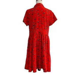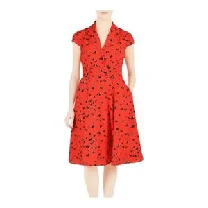 Chic red midi dress with black floral print. Features a flattering wrap design and cap sleeves. Ideal for versatile wear.