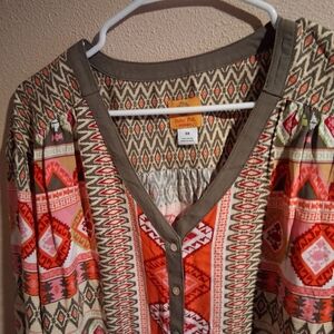 Ruby Rd. Womans V Neck Button Down Aztec Colorful Tie Waist Blouse Top 3X