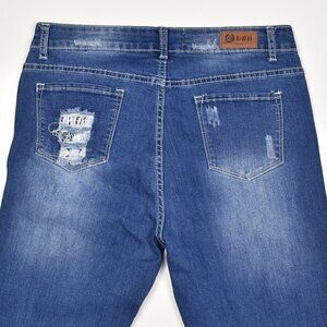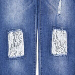 L&B Lucky & Blessed Distressed Jeans. Size 12. Distressed style with lace patches. Button and zip fly. Stretch material. Straight fit.
