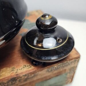 Cute Petite Rooster Teapot! Made out of Clay and painted in shiny black, this has a vintage vibe that doesn't quit! A rooster is crowing on the front in green, red, yellow, white, and gold, with brushstrokes, showing it's hand painted quality. There are red and gold flowers and leaves perched beside him. The removable lid has a gold rim painted on the base and knob. The backside has a set of flowers painted and a vintage sticker that says "Souvenir of Lake Okoboji, Iowa". The metal handle has a coil on top and is rusted, giving off a rustic charm. All of it is perched on three clay feet! This little guy is so cute and would be sweet posed on a kitchen shelf!