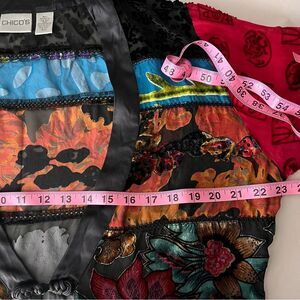 Chico's blouse with a bold floral pattern. Features black, red, and blue hues. Perfect for adding color to your outfit.