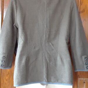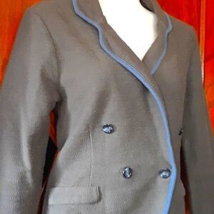 Banana Republic 100% cotton blazer in a grey nubby textured fabric with blue trim. Nice cut for a flattering fit. Great to throw over anything denim.