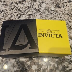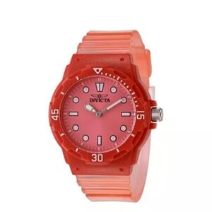 Stylish Invicta watch featuring a red face with black and gold accents. Comes in original packaging.
