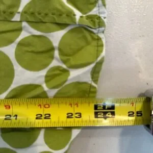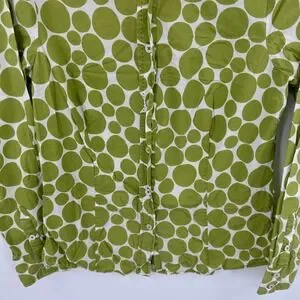 Charming women's button-down shirt by Boden featuring a playful green and white polka dot pattern. The collar offers a classic look, and the inner collar lining has a coordinating pink polka dot design. Perfect for casual outings, a day at the office, or a relaxed weekend brunch.