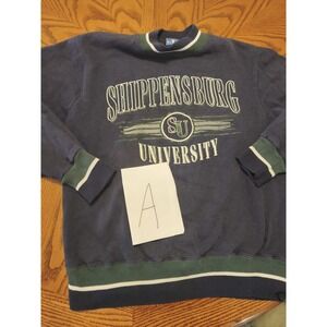 The product is a vintage Champion sweatshirt made in the USA, featuring a color block design representing Shippensburg University. This large pullover sweatshirt is suitable for both men and women, with a comfortable regular fit and multicolor design. Perfect for fans of the university or those looking for a stylish activewear piece, this Champion sweatshirt is a timeless addition to any wardrobe.