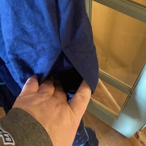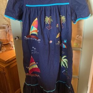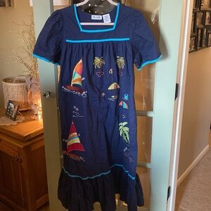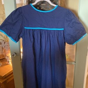 Get ready for summer in this super cute BLAIR embroidered dress! Navy blue with light blue trim on the sleeves and neckline. Square neckline. Side pockets to keep all your stuff handy! The size on the tag is SML. Please see BLAIR website www.blair.com for sizing details.