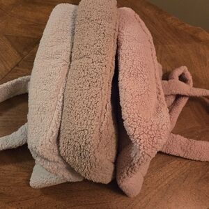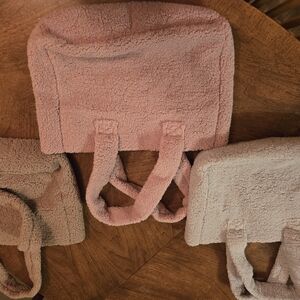 Set of 3 stylish sherpa tote bags. Available in soft pink, gray, and tan, it's perfect for any casual outing. Enjoy the plush texture and roomy interior for all your essentials. Originally $13 each. Lightly used. No tears, stains, or obvious wear.