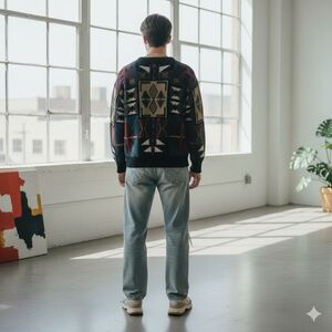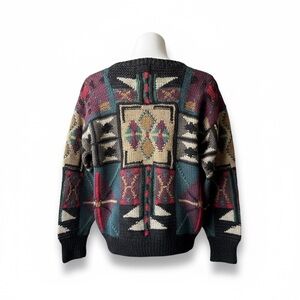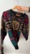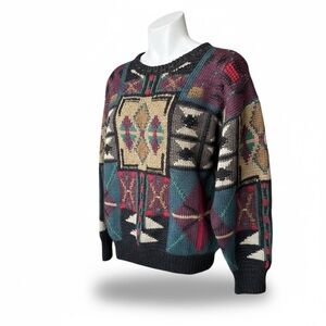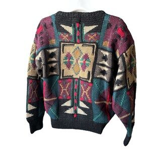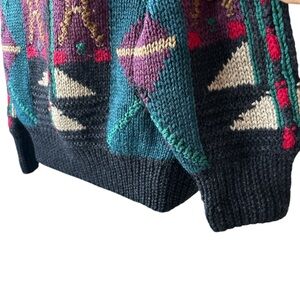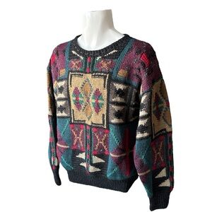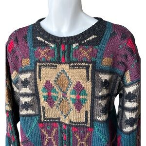 DESCRIPTION: Kick it old school in this vintage 90’s Vibrant knit sweater with geometric patterns! Wool hand knit Pullover Sweater with a crew neck featuring black, red, green, purple & beige colors. Ribbed cuffs and hem.