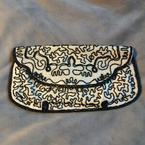 Vintage Women's Fabric White Clutch Abstract Black Beading