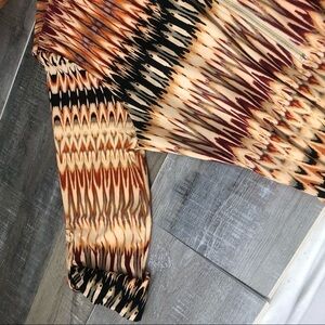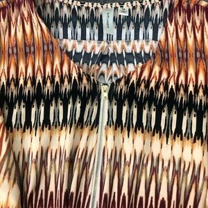 Tacera Multi-colored straight aztec type of design fitted dress. Has a matching tie belt. Has 3/4 length buttoned cuffed sleeve. Has a gold zipper down the front. Great preowned condition. Stretchy material. Size M