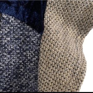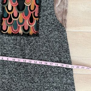 Multiple fabric textures on this dress are fun and cozy. It has a plain black velvet along the top of shoulders, a cocoa brown fuzzy fabric for the sleeves and a black woven knit fabric that is the main body of dress. The embroidery on the bust is colorful and adds lots of texture. This dress falls to just above the knees.