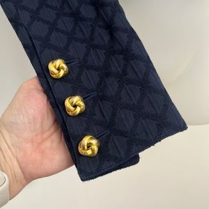 Valentino cropped open blazer in navy embroidered trellis pattern with goldstone knot button closures on the pockets and at the cuffs. Fabric is not listed. Feels like a cotton blend. There is no stretch. It is a slim fit on the arms. New to Poshmark? Use code LUXELOVET when you sign up and receive a $15 credit towards your first purchase!
