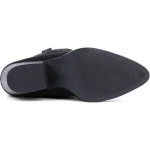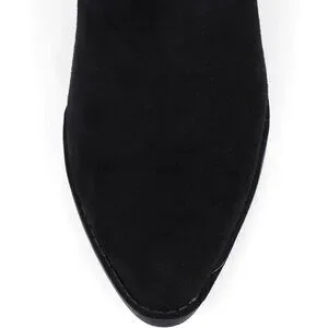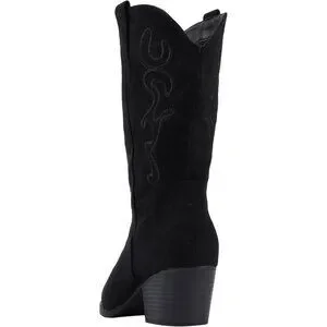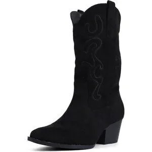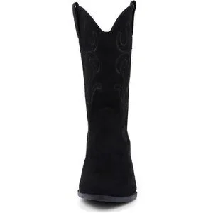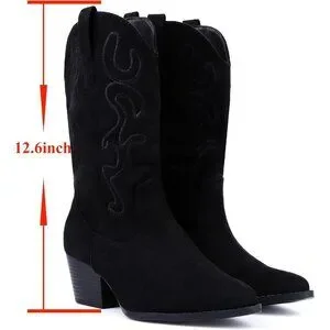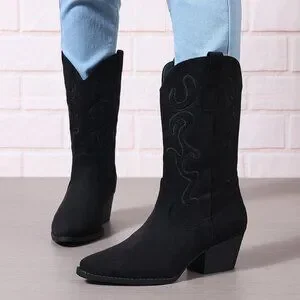 Women Black Suede Mid Calf Chunky Block Heel Western Embroidered Cowgirl Boot