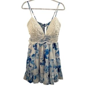 This is a beautifully unique warm weather /coastal cowgirl dress in classic blue and white with details you will love: