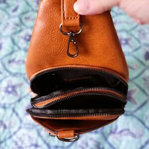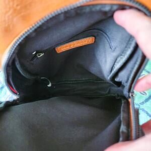 NWOT: Versatile, Sam & Hadley Cognac Brown Stud Embellishment Accent Sling Bag/Backpack in vegan leather with adjustable multicolor macrame guitar strap / gun metal hardware / multiple compartments / front flap lobster clasp & zip closure / divided fabric interior / medium size by Sam & Hadley.
