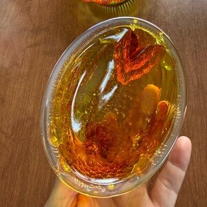 Beautiful 6 in Mosser Marigold carnival hen on nest. No condition callouts. She’s gorgeous! 365 & 395 uv light pics shows the glow and that’s during the day. Imagine her glow at night! I collect the minis and decided she should go to a new home. I pack carefully and ship quickly! Smoke free home.