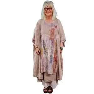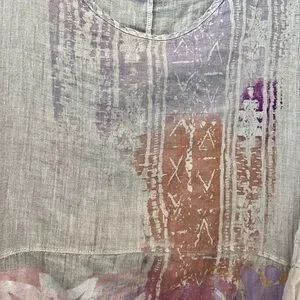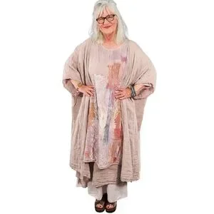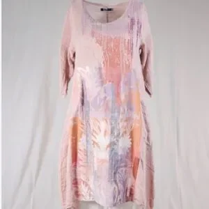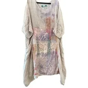 Sizing is in last photo. This is a size 2. You can iron this dress (one the wrong side, but I rarely iron the soft linen of Blue Fish. The color of this dress is a soft blush pink. Each hand print is unique and different.
