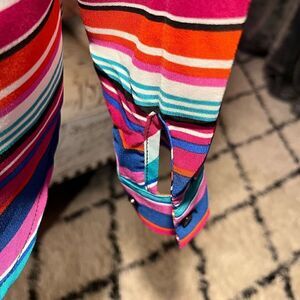 Awesome semi sheer, long sleeve top. Rounded neckline with a V front along with two hidden buttons. Sleeves can roll up with a strap and button.
