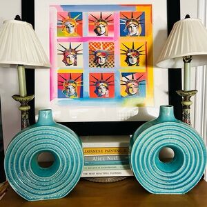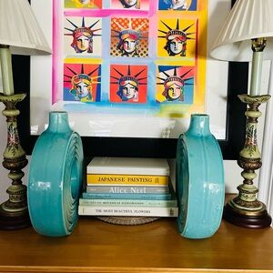 This impressive 16-inch sculptural vase is a statement of modern artistry and refined taste. Rendered in a rare turquoise glaze, its circular form—with a 12-inch diameter and finely textured concentric ridges—creates a commanding presence that feels serenely coastal. Discontinued and scarce in this distinctive hue, it stands as a collectible centerpiece of contemporary design.
