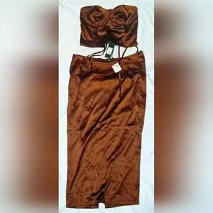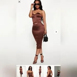 Chic satin skirt set in rich chocolate. Strapless top with matching midi skirt. Perfect for a night out.