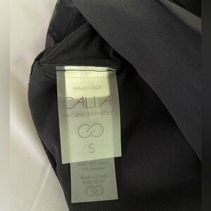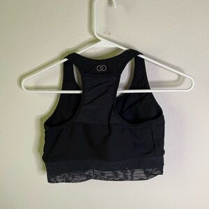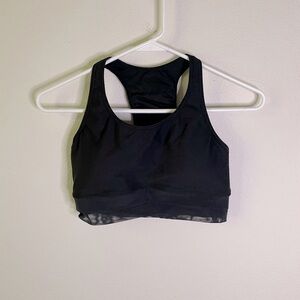 Calia by Carrie Underwood black sports bra. This sports bra is black with a racer back style. There is a pocket on the back. Padded. Sheer detail around the bottom of the sports bra. Size small.