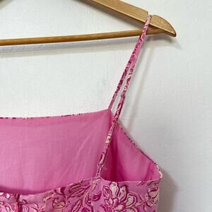 Features: Floral pink print, adjustable spaghetti straps, faux wrap skirt, fully lined, zipper back closure