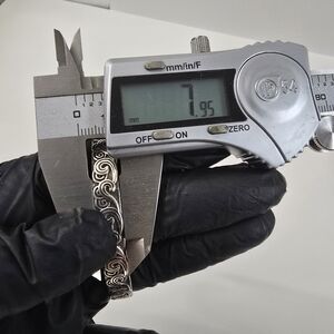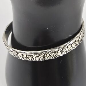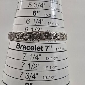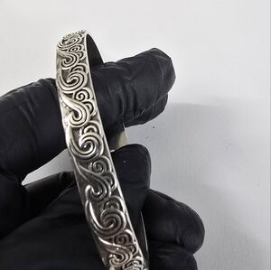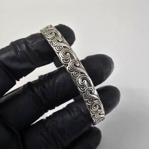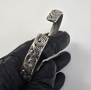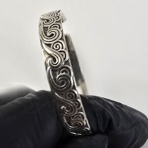 Description: Gorgeous silver bracelet with intricate swirl design. Perfect for any occasion. Screams Native American style motifs. Origin of maker is unknown, but the design and carvings are highly attractive.