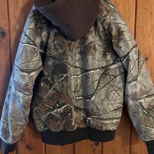 Has a small Tear beside collar it's not a hole. Has a zipper and buttons very warm coat. Logo on front