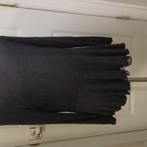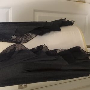 Lightweight gray cardigan. Black Lace ruffled trim. Cute fit like a open front blazer