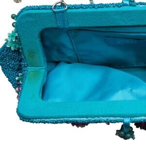 Zara Blogger Favorite Multicolor Beaded Floral Crossbody Bag. Teal Blue Beaded Clutch bag with Magenta Pink, Purple, and Green Sequin and Beaded Embellished Bag. 3D Embellished Bag with Tassel Beads & Silver Chain Crossbody Strap.