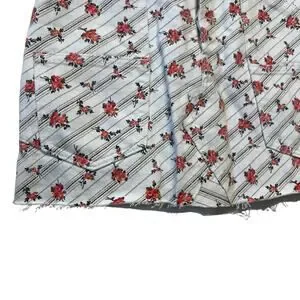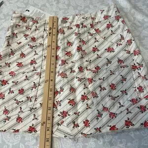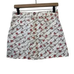 Sweet florettes of rosebuds follow the path of diagonal pinstripes across the clean white backdrop of this denim miniskirt. Patch pockets and a raw hem contrast the youthful femininity cultivated by the lovely print.