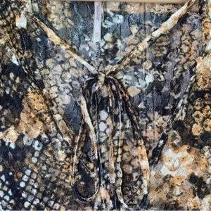 This lightweight, flowy blouse features an oversized fit, sheer fabric, and a lace-up neckline for an effortlessly cool boho look. The neutral brown and black snake print makes it a versatile statement piece—perfect for layering over a bralette or pairing with denim, trousers, or shorts.
