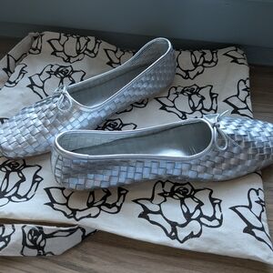 worn once, but were slightly too tight for me. bow detail, square toe, 100% Spanish calf leather, padded leather foot bed, .25 inch sole, dust bag included