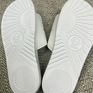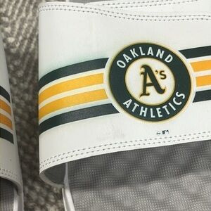 New Oakland A’s athletics slide sandals. Left sandal has some smudging of the top green stripe as shown in picture.