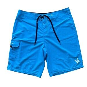 Hurley Phantom boardshorts in bright blue keep things clean and sporty, with a lace-up drawstring waist for a secure fit that stays put in the waves. Lightweight, quick-dry fabric helps you go from surf session to beach hang without feeling weighed down. A cargo pocket with flap plus key loop keeps small essentials close, and subtle Hurley logos finish the look. Great for surfing, swimming, pool days, vacations, and lake weekends. Condition: Pre-owned.