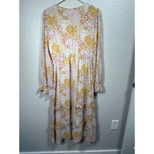 Keywords: midi dress, floral dress, ruffle trim, tiered dress, v-neck, long sleeve, womens dress, party dress, occasion dress, summer dress, bohemian, boho