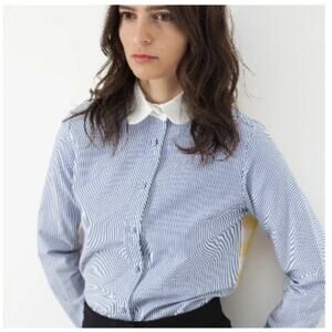 Effortless chic Harvey Faircloth blouse makes a lively twist of yellow. Contrasting in color and material, the back panel navigates any age. Single front button placket opening. Peter Pan collar. Color Blue Stripe. 100% Cotton front, 100% Silk back. Made in U.S.A.