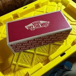 Vans Classic Slip-On box in red and brown. Iconic style packaging.
