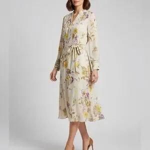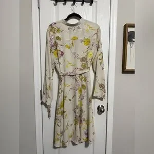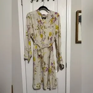 Elegant cream dress with floral print. Features a tie waist and long sleeves. Perfect for any occasion.