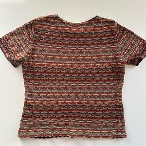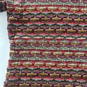 Elegant knit top with burgundy, gold, purple and blue tones. Features intricate patterns.