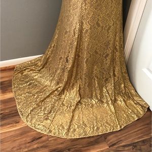Gorgeous! 💫💫💫 Full Length Lined Maxi Gold Lace Illusion Formal Evening Gown. Slight Stretch Material, Padded Bra, Deep V Plunge Illusion With Low Open Strap Back. Long Flowing Skirt With Front Slit 35”, Slight Train. It’s Exquisite! ✨🌹✨