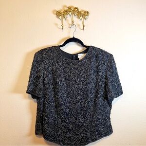 Elegant Papell Boutique Evening Embellishments top with intricate silver embroidery and beads. Short sleeves. Perfect for formal occasions. 100% silk