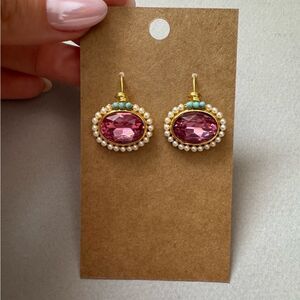 Stunning earrings featuring vibrant pink gemstones set in gold. Accented with turquoise and pearl details.