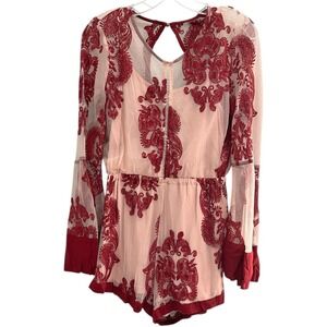 MINIPINK Burgundy Sheer Mesh Romper Bell Sleeve Boho Festival Floral Size Small