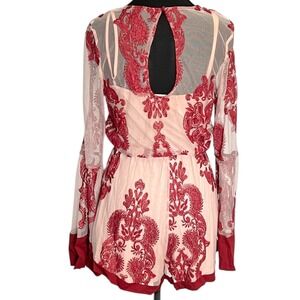 MinkPink sheer mesh romper in a soft blush/nude base with deep burgundy embroidered floral detailing. Features a lightweight semi-sheer overlay, long bell sleeves with contrast cuffs, an elastic waist for a flattering fit, and flowy shorts with a soft lining. Feminine, romantic silhouette with boho and festival vibes.